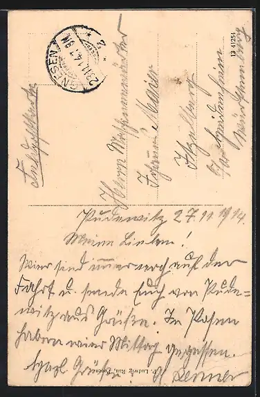 alte Ansichtskarte, gelaufen 1914 als Feldpost, Eckknicke links unten, guter Zustand