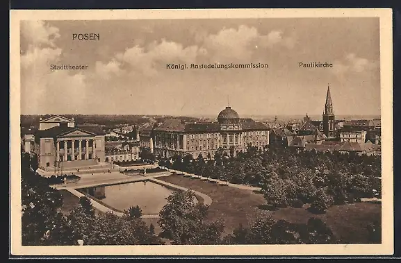 AK Posen, Stadttheater, Königl. Ansiedlungskommission, Paulikirche aus der Vogelschau