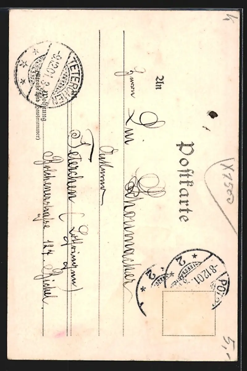 Personenbezogene Daten auf der Rückseite der Karte wurden durch blauen Textmarker unkenntlich gemacht. Die blauen Stellen sind auf die Vorderseite durchgeweicht und wirken sich negativ auf das Postkartenfoto aus