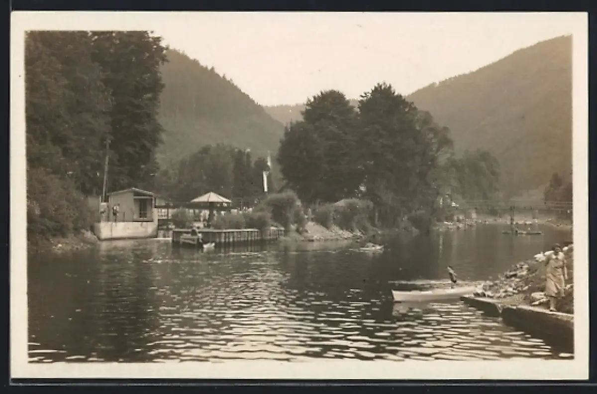 AK Potstejn, Lazne, Flussbad mit Gebirge