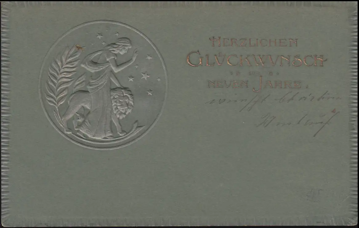 AK Prägekarte Jugendstil Neues Jahr: Frau mit Löwe, DÜSSELDORF, um 1900
