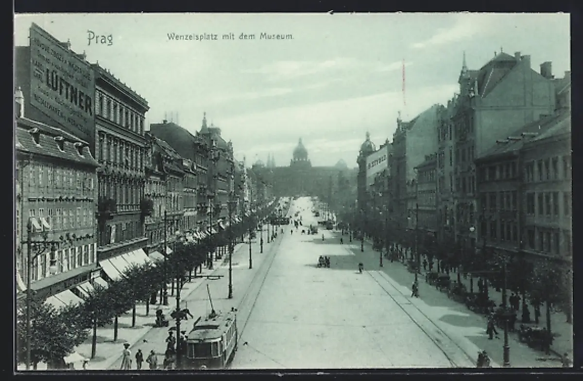 AK Prag / Praha, Sicht über den Wenzelsplatz mit Strassenbahn und Museum, Václavské námestí