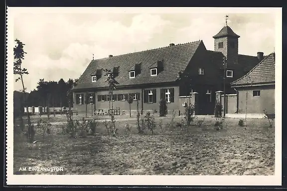 AK Prebelow /Kr. Neuruppin, Am Eingangstor der Jugendherberge