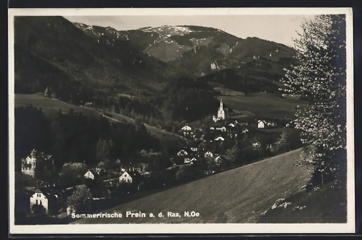 AK Prein a. d. Rax /N.-Oe., Ortsansicht mit Kirche vor Bergkulisse
