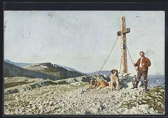AK Preitnerwandkreuz und Mann mit zwei Bernhardinern am Raxplateau
