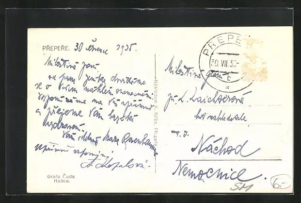 Personenbezogene Daten auf der Rückseite der Karte wurden durch blauen Textmarker unkenntlich gemacht. Die blauen Stellen sind auf die Vorderseite durchgeweicht und wirken sich negativ auf das Postkartenfoto aus