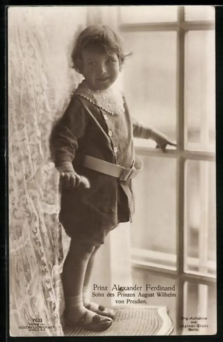 AK Prinz Alexander Ferdinand in jungen Jahren steht auf einem Stuhl am Fenster, Sohn d. Prinzen August Wilhelm v. Preusse