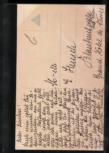 Personenbezogene Daten auf der Rückseite der Karte wurden durch blauen Textmarker unkenntlich gemacht. Die blauen Stellen sind auf die Vorderseite durchgeweicht und wirken sich negativ auf das Postkartenfoto aus