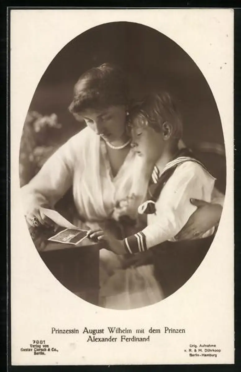 AK Prinzessin August Wilhelm von Preussen sieht sich mit Prinz Alexander Ferdinand Fotos an