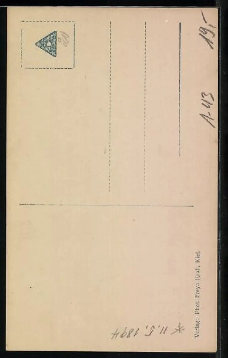 Personenbezogene Daten auf der Rückseite der Karte wurden durch blauen Textmarker unkenntlich gemacht. Die blauen Stellen sind auf die Vorderseite durchgeweicht und wirken sich negativ auf das Postkartenfoto aus