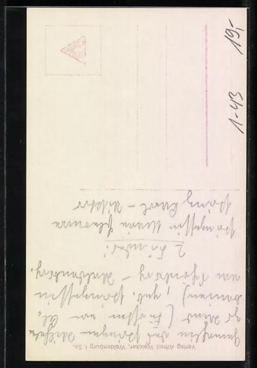 Personenbezogene Daten auf der Rückseite der Karte wurden durch blauen Textmarker unkenntlich gemacht. Die blauen Stellen sind auf die Vorderseite durchgeweicht und wirken sich negativ auf das Postkartenfoto aus