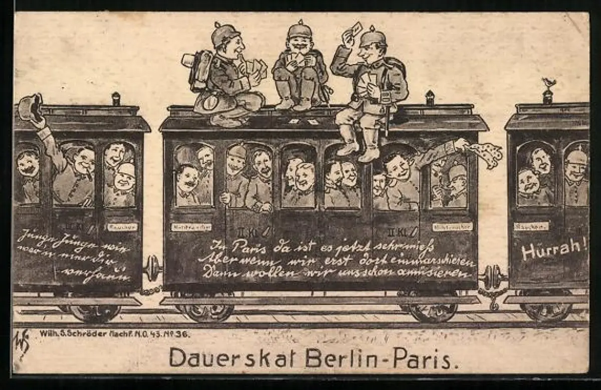 AK Propaganda 1. Weltkrieg, Soldaten spielen in der Eisebahnskat auf der Fahrt an die französ. Front
