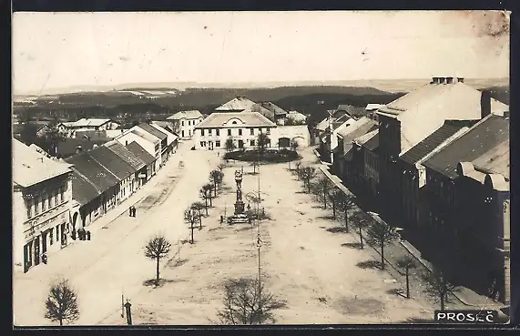 AK Prosec, Strassenpartie mit Säulendenkmal aus der Vogelschau