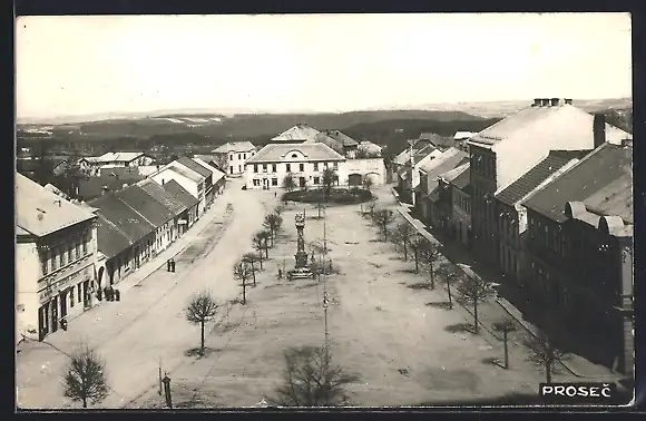 AK Prosec, Strassenpartie mit Säulendenkmal aus der Vogelschau