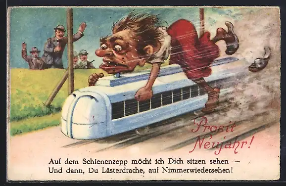 AK Prosit Neujahr!, Auf dem Schienenzepp möcht ich Dich sitzen sehen - und dann, Du Lästerdrache, auf Nimmerwiedersehen!