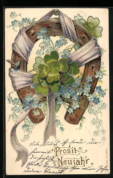 AK Prosit Neujahr, Hufeisen mit Kleeblättern
