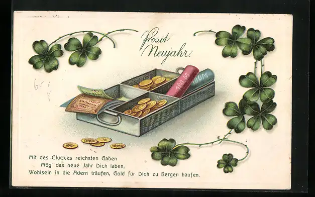 AK Prosit Neujahr, Mit des Glückes reichsten Gaben..., Geld und Klee