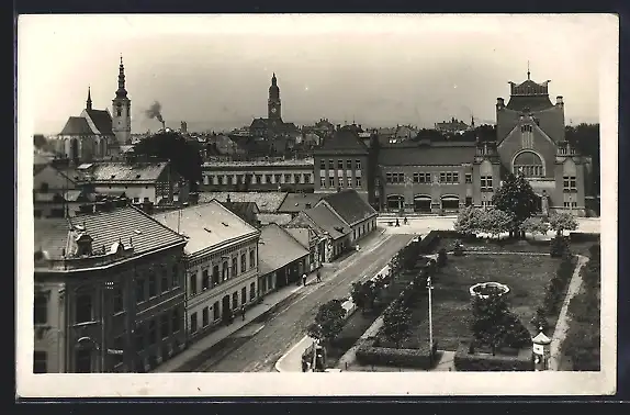 AK Prostejov, Grünanlage mit Strasse aus der Vogelschau