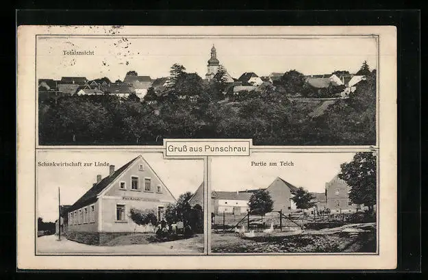 AK Punschrau, Totalansicht, Schankwirtschaft z. Linde, Partie am Teich