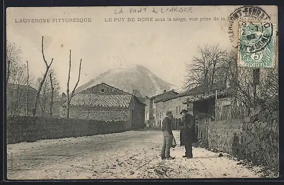 AK Puy de Dôme, sous la neige, vue pittoresque de la rue avec deux hommes en conversation
