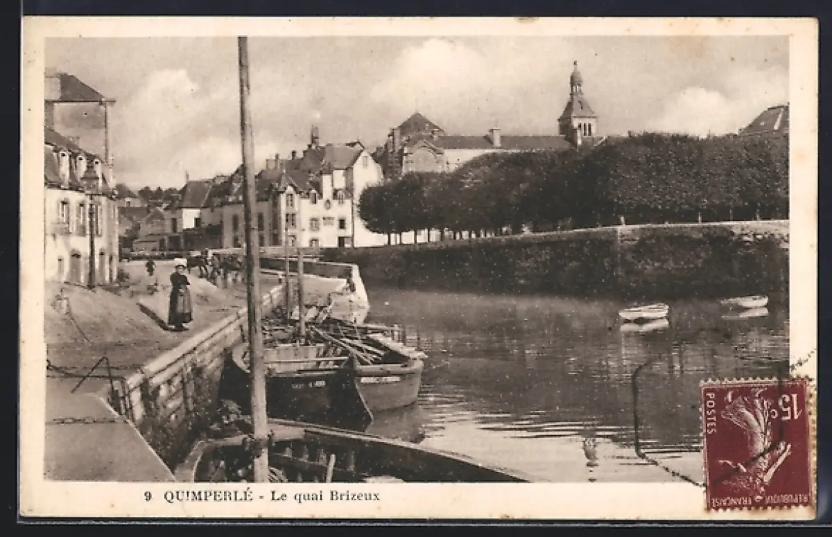 AK Quimperlé, Le quai Brizeux avec vue sur les bateaux amarrés et l`église en arrière-plan
