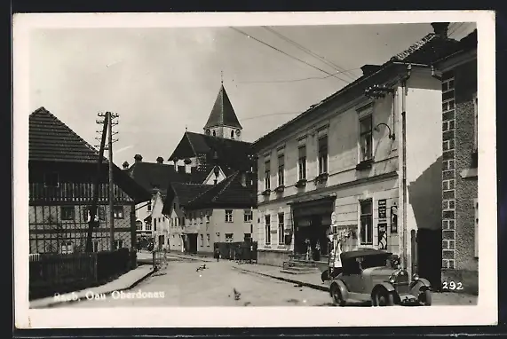 AK Raab, Strassenpartie im Ortskern, Blick zum Kirchturm