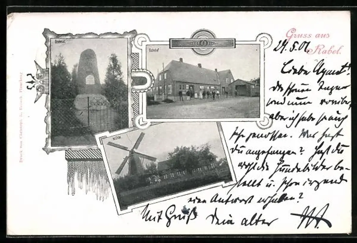 AK Rabel, Bahnhof, Denkmal und Mühle