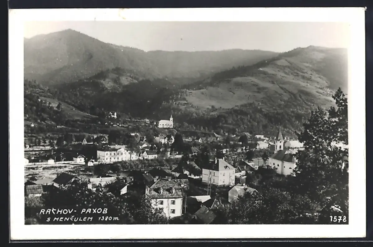 AK Rachov-Paxob, Totalansicht mit Bergpanorama aus der Vogelschau