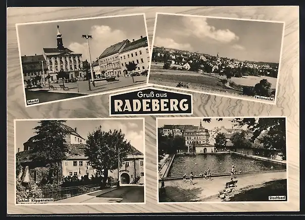 AK Radeberg, Markt, Teilansicht, Schloss Klippenstein und Stadtbad