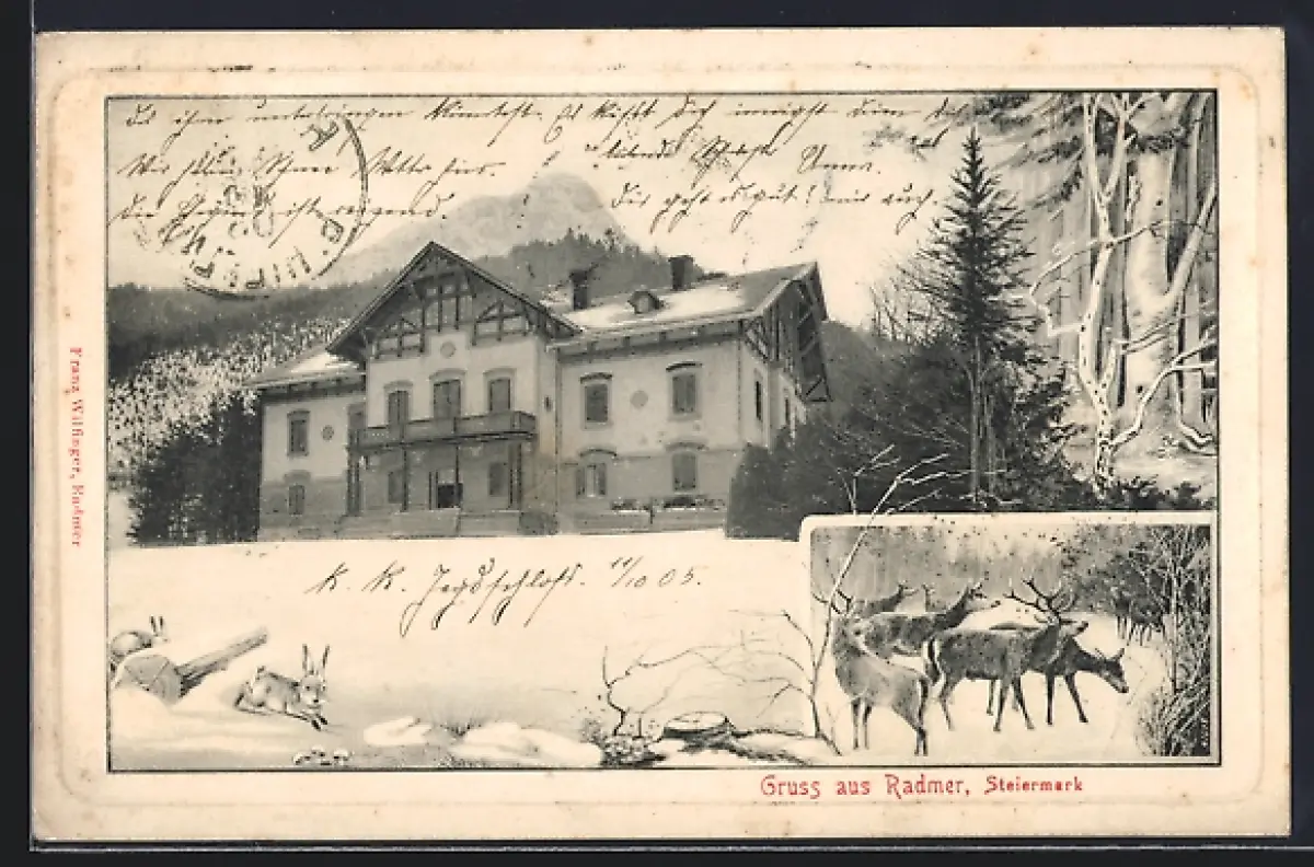 AK Radmer, Gebäudeansicht im Winter, Hirsche und Hasen