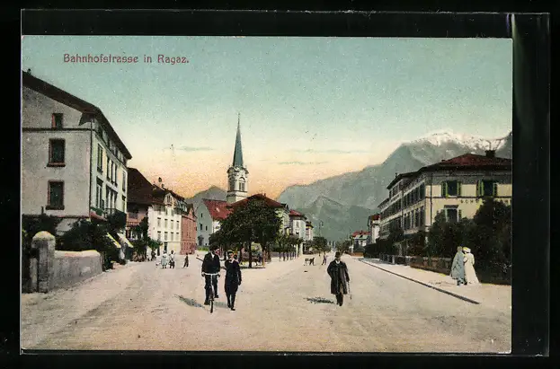 AK Ragaz, Bahnhofstrasse mit Radfahrer