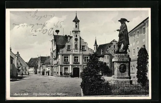 AK Rain a. Lech, Tilly-Denkmal mit Rathaus