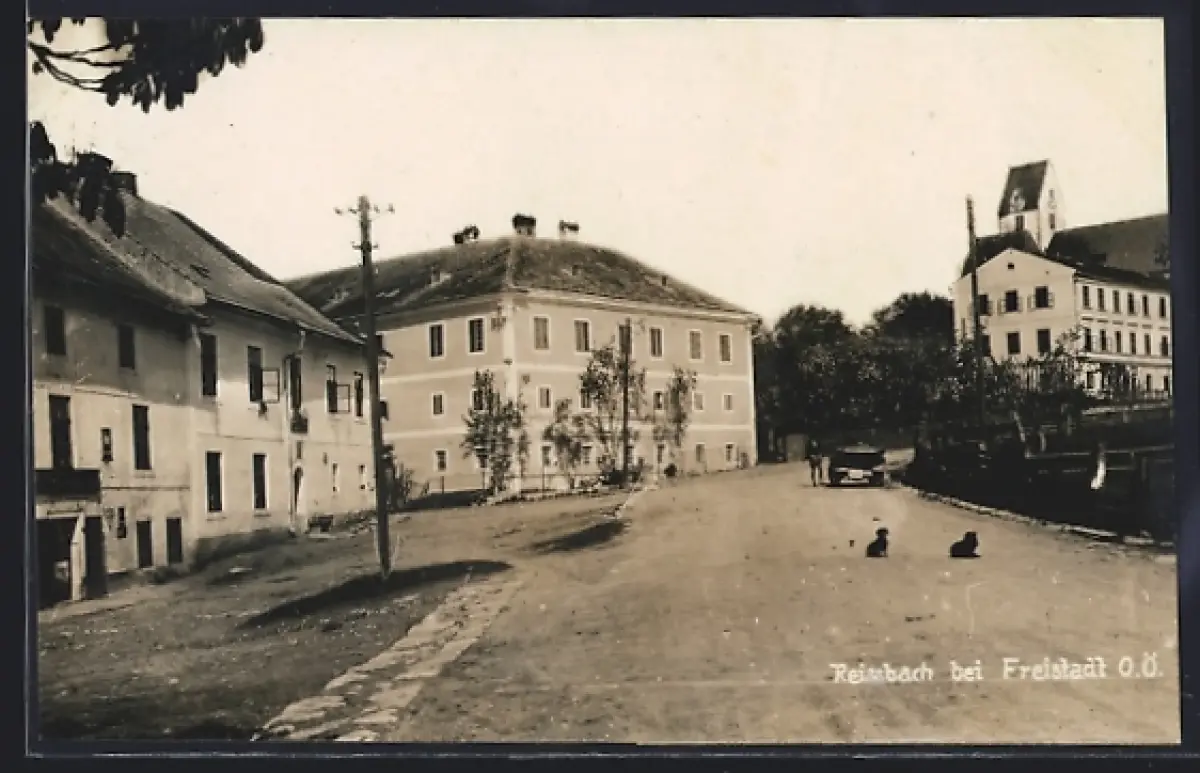 AK Rainbach bei Freistadt, Strassenpartie mit zwei Hunden