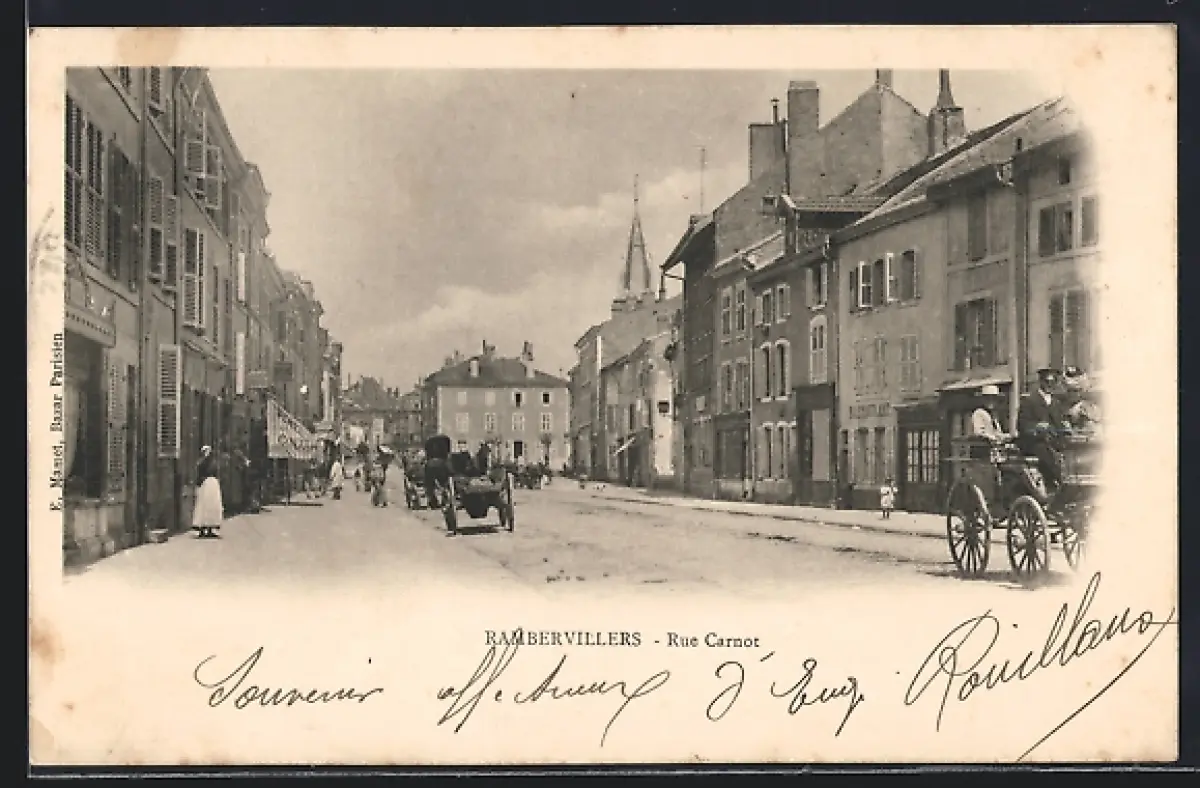 AK Rambervillers, Rue Carnot animée avec calèches et passants