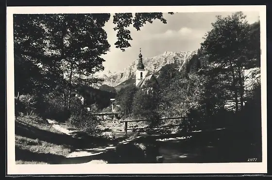 AK Ramsau, Kirche am Fluss mit Reiteralpe