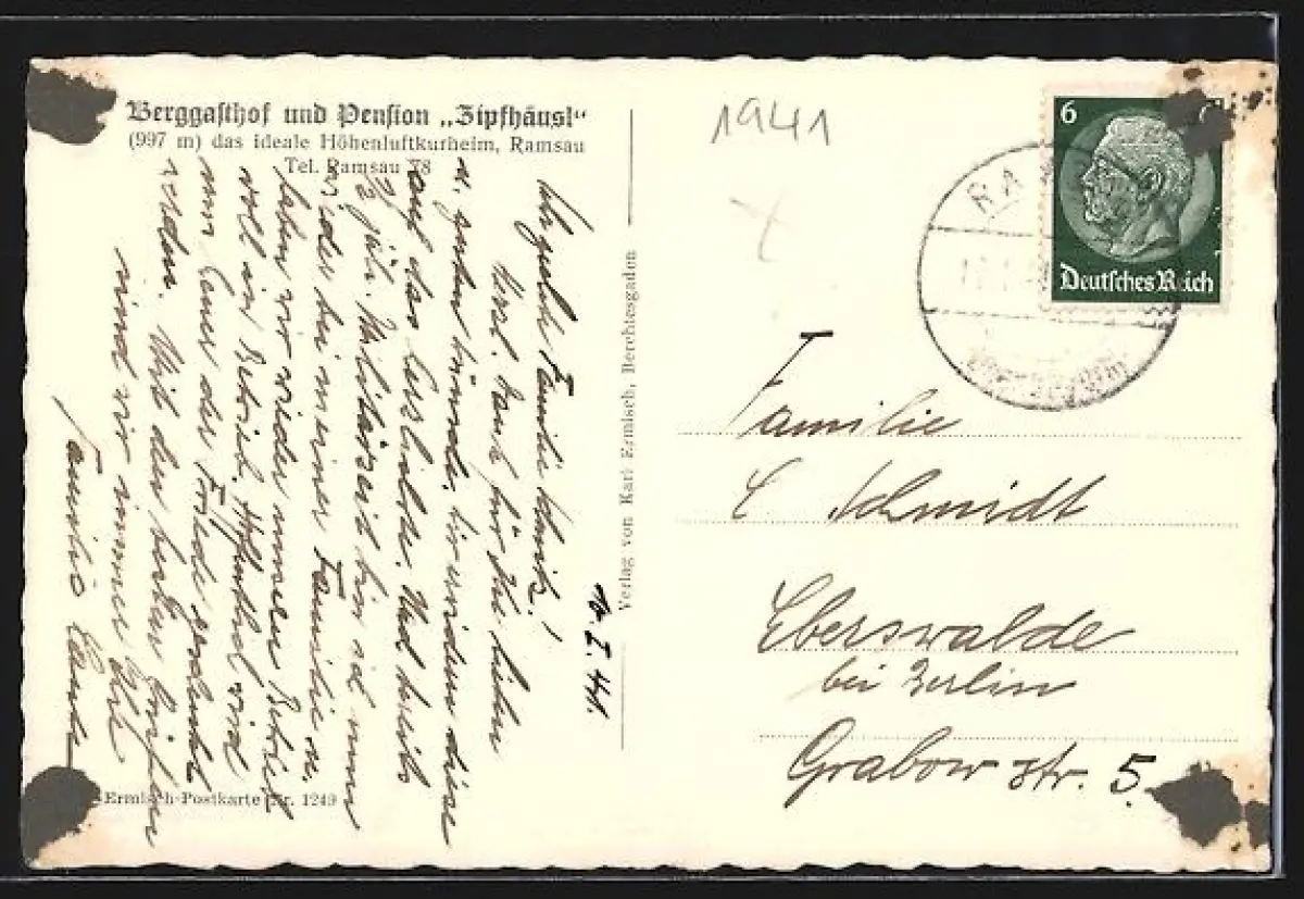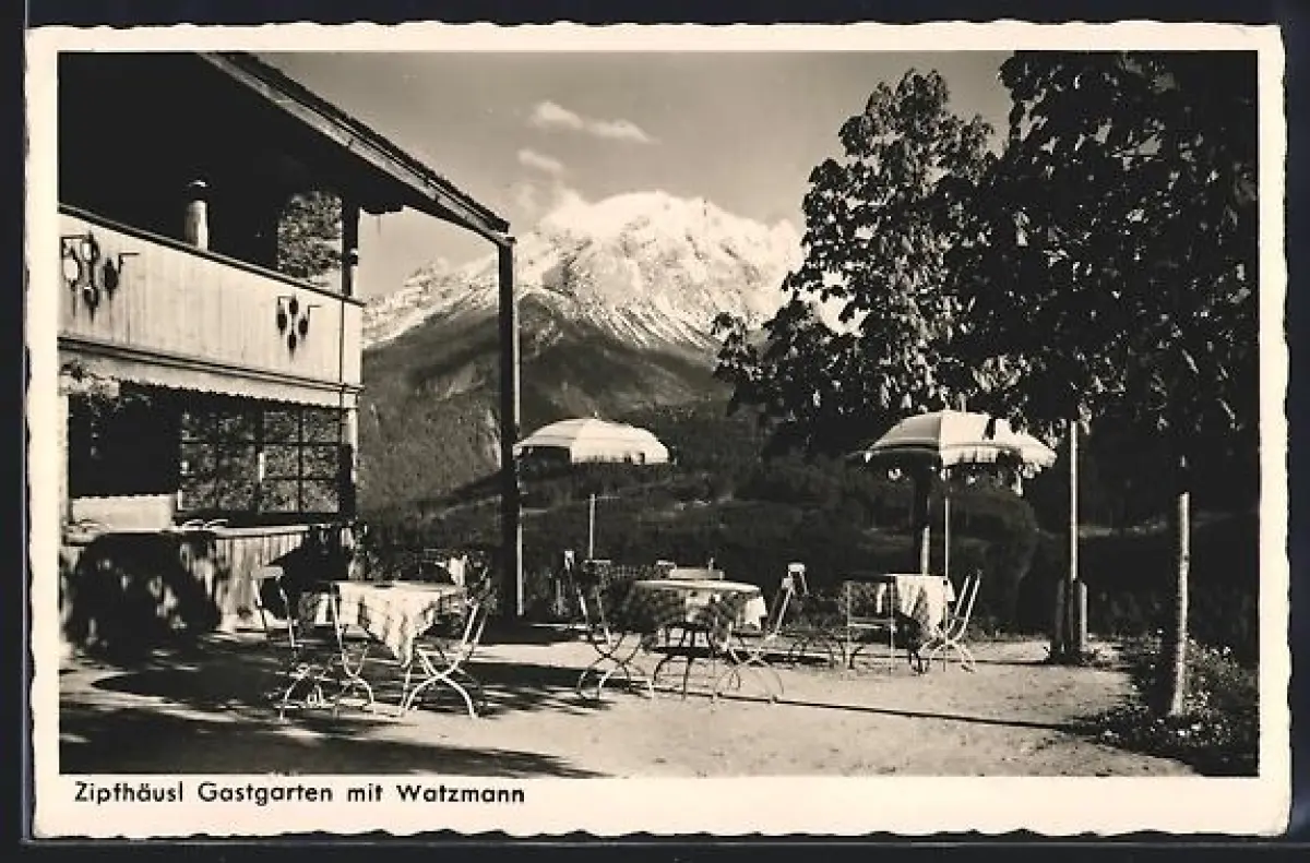 AK Ramsau, Zipfhäusl Gastgarten mit Watzmann