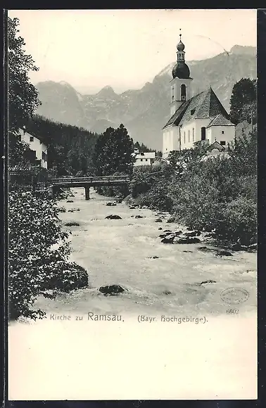 AK Ramsau / bay. Alpen, Uferpartie mit Kirche