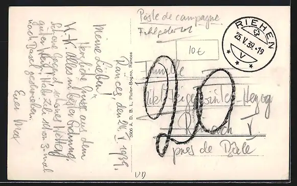 Personenbezogene Daten auf der Rückseite der Karte wurden durch blauen Textmarker unkenntlich gemacht. Die blauen Stellen sind auf die Vorderseite durchgeweicht und wirken sich negativ auf das Postkartenfoto aus