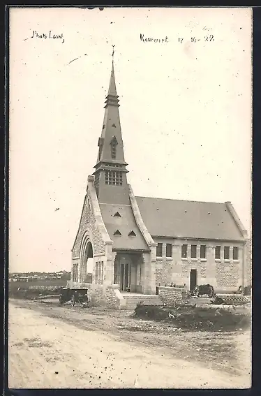 AK Rancourt, Église avec clocher élancé et route adjacente