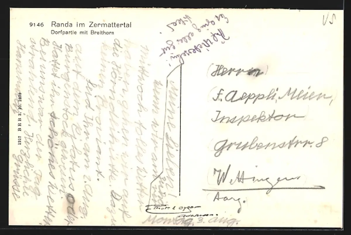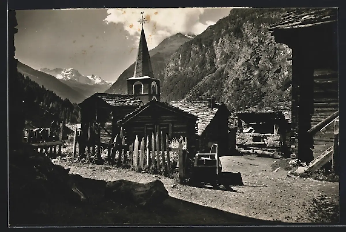 AK Randa im Zermattertal, Ortspartie mit Breithorn