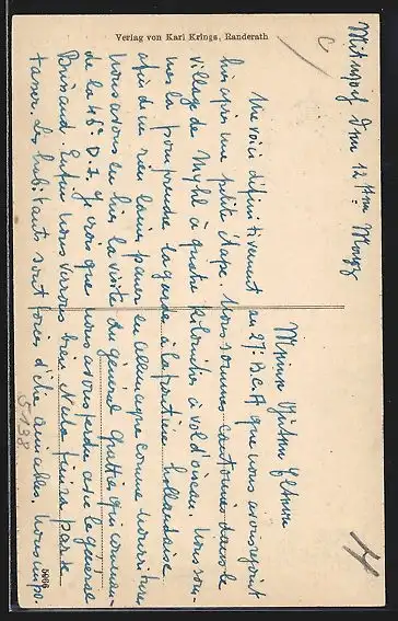 Personenbezogene Daten auf der Rückseite der Karte wurden durch blauen Textmarker unkenntlich gemacht. Die blauen Stellen sind auf die Vorderseite durchgeweicht und wirken sich negativ auf das Postkartenfoto aus