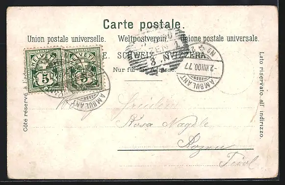 gelaufen 1900, Eckknick li. unten, Bugspur li. diagonal, guter Zustand