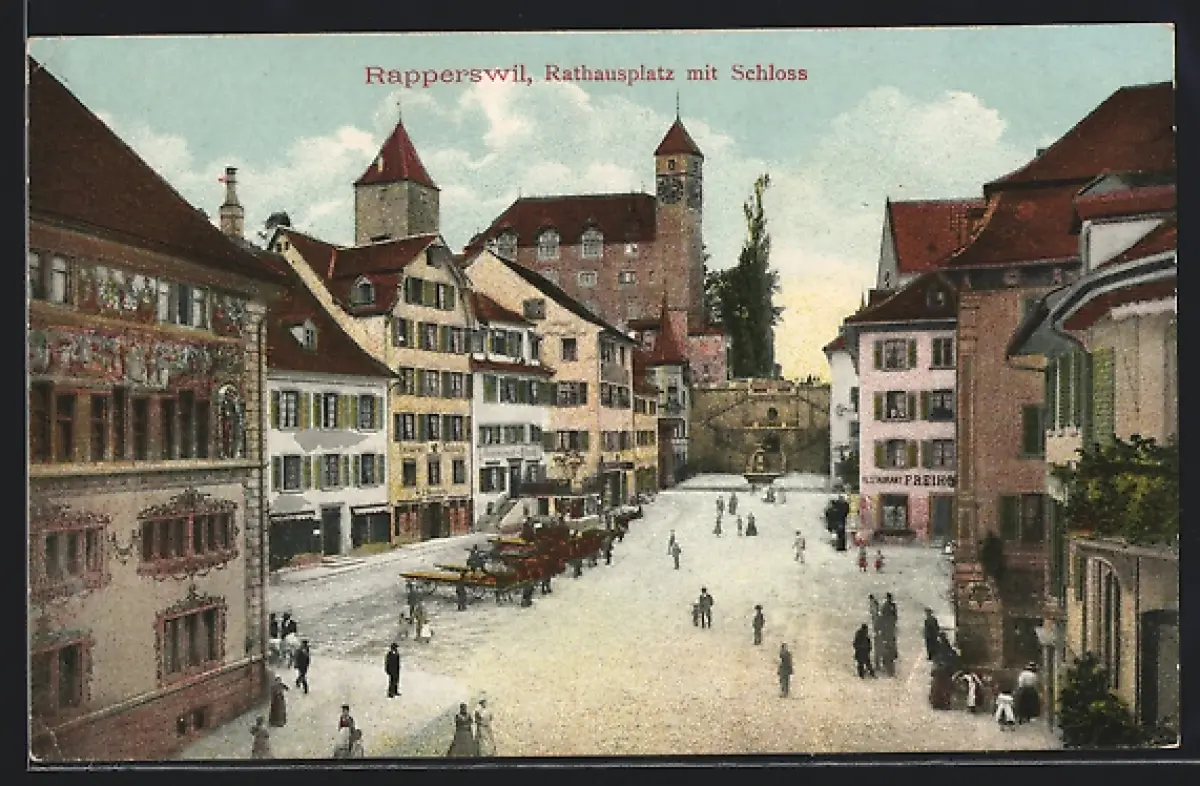 AK Rapperswil, Rathausplatz mit Restaurant Freihof u. Schloss aus der Vogelschau