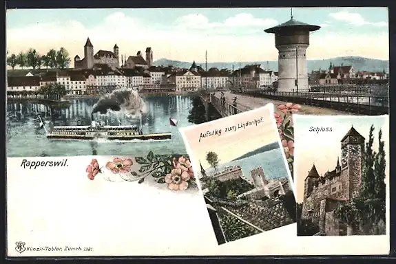 AK Rapperswil /SG, Ortsansicht mit Dampfer, Aufstieg zum Lindenhof, Schloss