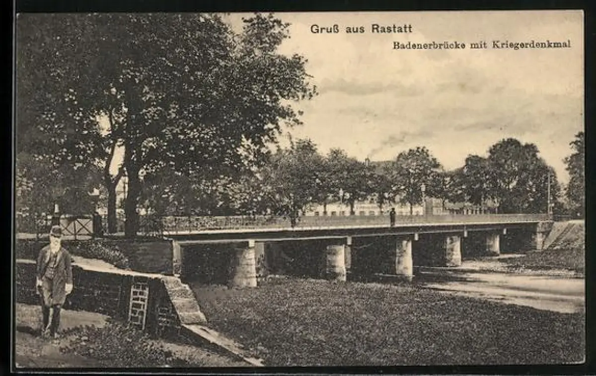 AK Rastatt, Badenerbrücke mit Kriegerdenkmal