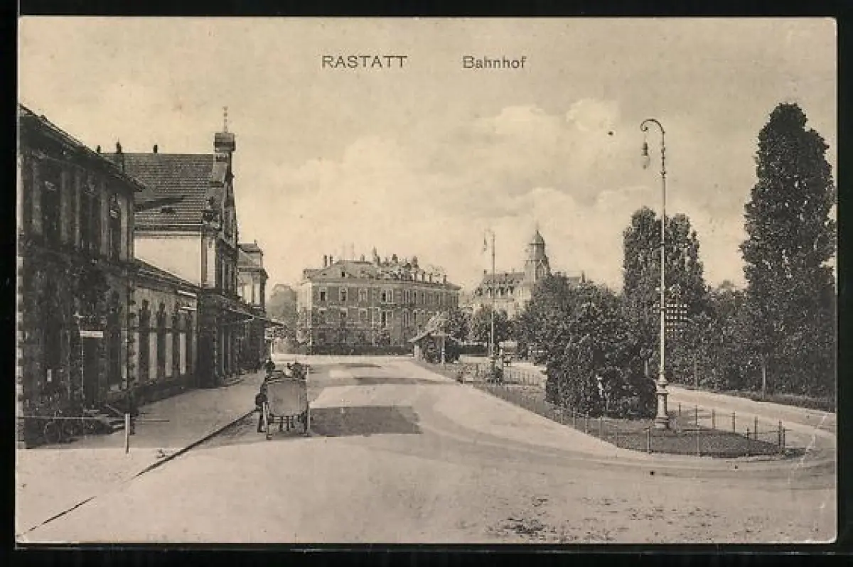 AK Rastatt, Bahnhof mit Vorplatz u. Kutsche