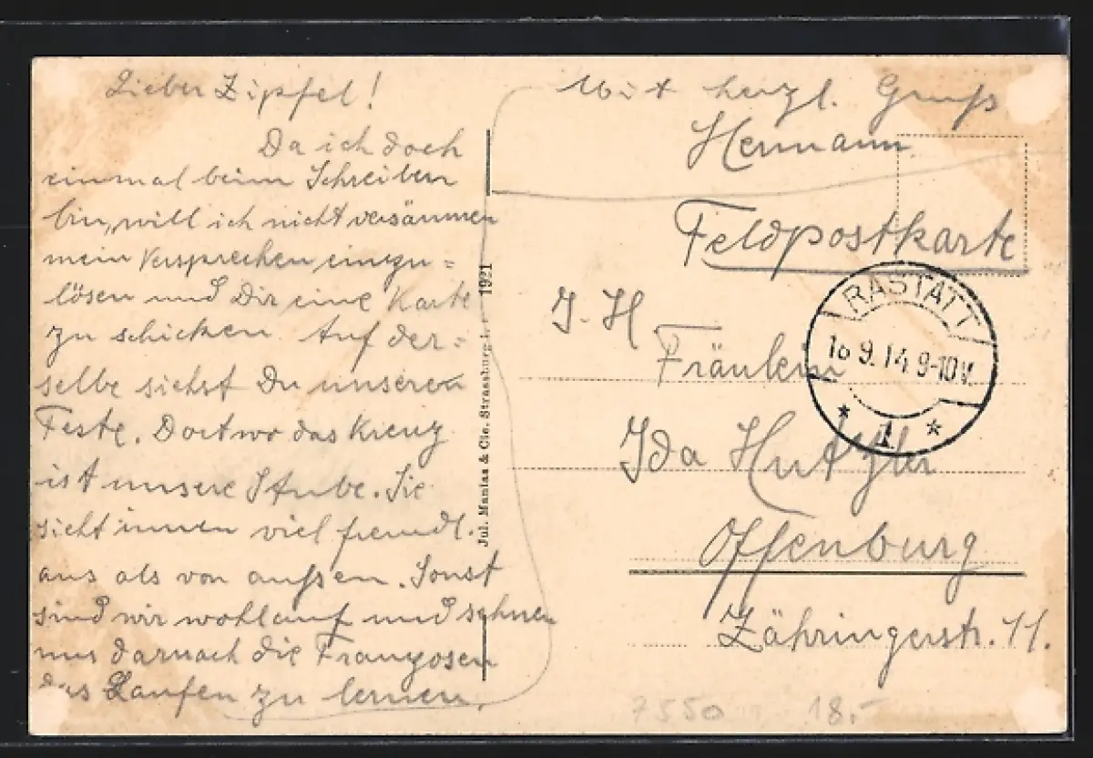 gelaufen 1914, rückseitig Oberflächenschaden, guter Zustand