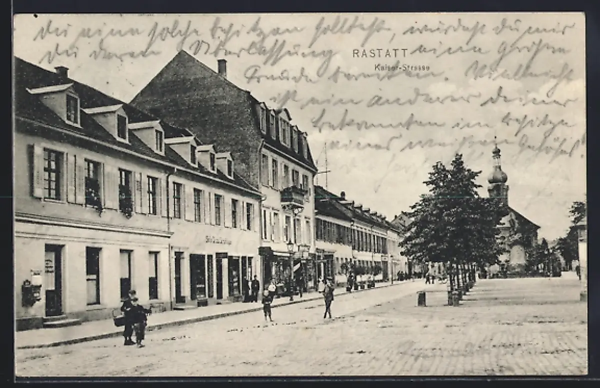 AK Rastatt, Kaiser-Strasse mit Geschäften und Denkmal