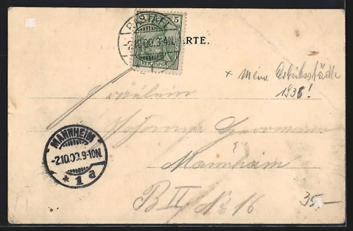 alte Ansichtskarte, gelaufen 1900, Bugspur oben links, rückseitig Klebe- und Papierreste, guter Zustand
