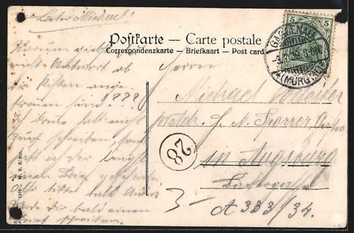 alte Ansichtskarte, gelaufen 1909, rückseitig Klebe- und Papierreste, guter Zustand